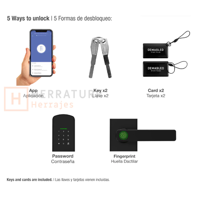 Esta cerradura biométrica permite múltiples formas de desbloqueo y se adapta a distintos tipos de puertas, como madera, vidrio templado o UPVC. Su diseño moderno, fabricado con materiales resistentes, y su conectividad inteligente la convierten en una alternativa segura, confiable y versátil.