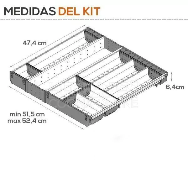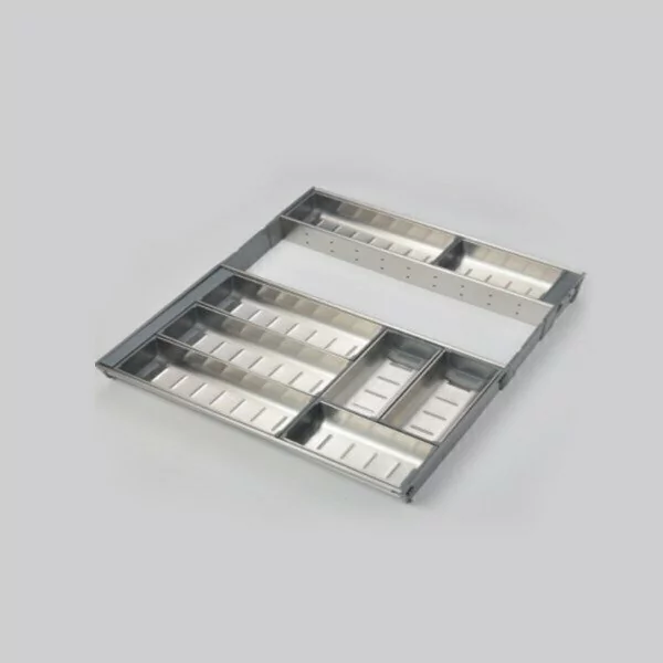 Se compone por un marco de acero y 2 divisiones interiores con 8 cubetas contenedoras extraibles para poder lavar y 1 modulo de bastidor para generar nuevos espacios dentro del cajón.