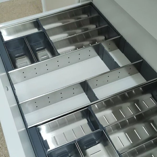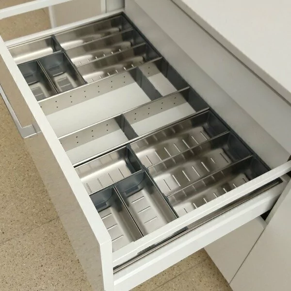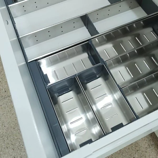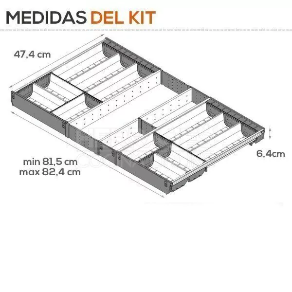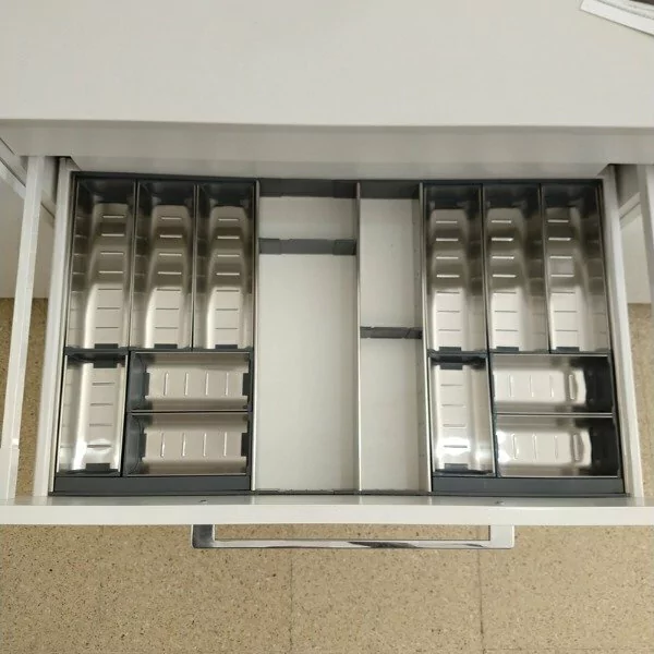 Se compone por un marco de acero y 2 divisiones interiores con 12 cubetas contenedoras extraibles para poder lavar y 2 modulo de bastidor con divisores ajustables para generar nuevos espacios dentro del cajón.